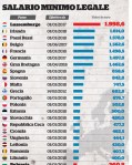Il salario minimo legale esiste nella maggioranza dei Paesi europei – 22 su 27 – e stabilisce per legge una soglia minima di retribuzione al di sotto della quale non si può andare. Come si vede dalla tabella, si passa dai quasi 2.000 euro al mese, lordi, del Lussemburgo, ai 260 della Bulgaria. Nel plotone di testa si trovano i 6 firmatari del Trattato di Roma del 1957, tranne l’Italia. E sono proprio questi ad avere i livelli più alti. In fondo c’è l’Europa dell’Est. I cinque Paesi che restano fuori sono Austria, Danimarca, Finlandia, Svezia e Italia. Che hanno la caratteristica di avere garanzie sul piano dei contratti e della retribuzione consolidate. Qui c’è il punto di fondo del contrasto tra le ipotesi di salario minimo legale e le posizioni del sindacato. Quest’ultimo chiede di fare affidamento alla contrattazione tra le parti come strumento più efficace per retribuzioni dignitose. La via legale, si sostiene, potrebbe rappresentare il grimaldello per introdurre riduzioni di fatto dei salari. Quello che però va messo sulla bilancia è il peso crescente del “lavoro povero” che, come stima l’Anpal nel suo rapporto 2018 sul mercato del lavoro, interessa 3 milioni di lavoratori, “5,2 milioni se si considera il reddito annuale, invece di quello mensile”. E su questo versante, dice il rapporto, anche se gli studi economici concordano nel ritenere quasi nulli gli effetti sull’occupazione, “il salario minimo potrebbe garantire – in virtù di una maggiore forza prescrittiva – una protezione più efficace nei confronti dei bassi salari, riducendo la discrezionalità e gli abusi nella determinazione dei livelli retributivi”.