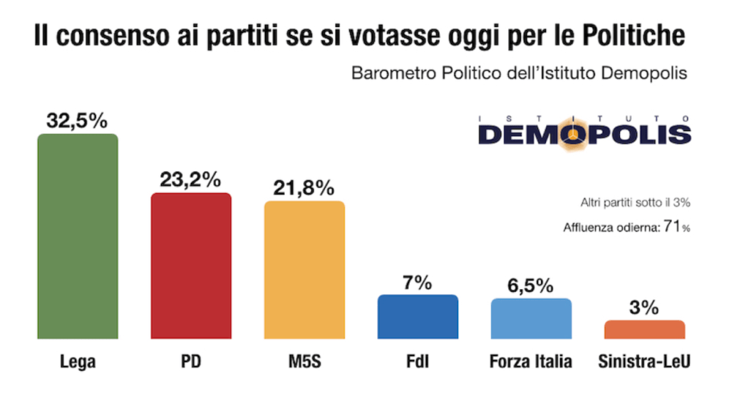 Crolla di 4,5 la Lega rispetto al mese di maggio, mentre resta stabile o cresce il consenso per i due partiti che compongono il nuovo esecutivo: Pd e Movimento 5 stelle. Se si andasse al voto oggi, il Carroccio rimarrebbe tuttavia il primo partito con una percentuale che oscilla, a seconda dei sondaggi, tra il 32 e il 33%, secondi i dem che piacciono quasi a un italiano su quattro. Il partito di Luigi Di Maio, invece, recupera in parte i voti persi alle europee, con una percentuale di consensi che oscilla tra il 19,7 e il 22 per cento. Non c’è una maggioranza netta. Il presidente del Consiglio continua a ispirare fiducia agli italiani: piace a quasi un italiano su due. Sono i risultati di due diversi sondaggi, uno condotto da Demopolis e presentato l’11 settembre a Otto e Mezzo su La7, e l’altro presentato da Emg e trasmesso da Agorà su Rai 3.