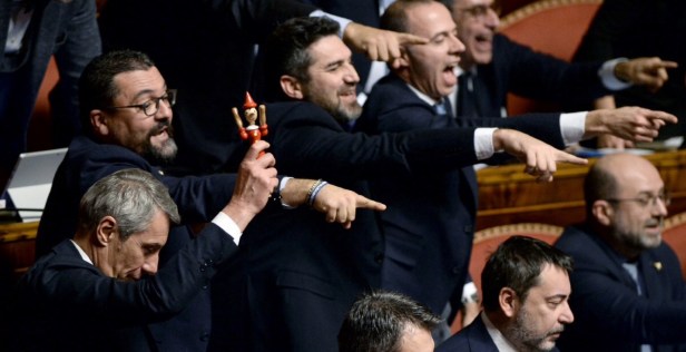 I cinquestelle sono i senatori Malavoglia. Mentre il gruppo della Lega è tonico, ambisce a soluzioni teatrali e infatti, anche grazie alla partecipazione della presidente Casellati, realizza una gag di livello. Esibiscono un pupazzo, un Pinocchio. La Casellati, ingenua per davvero o per finta, non chiede di toglierlo di mezzo ma dice: “Vedo un Pinocchio!”. Ecco i leghisti che all’unisono alzano le braccia: “È lì, è lui”. E tutto finisce così.