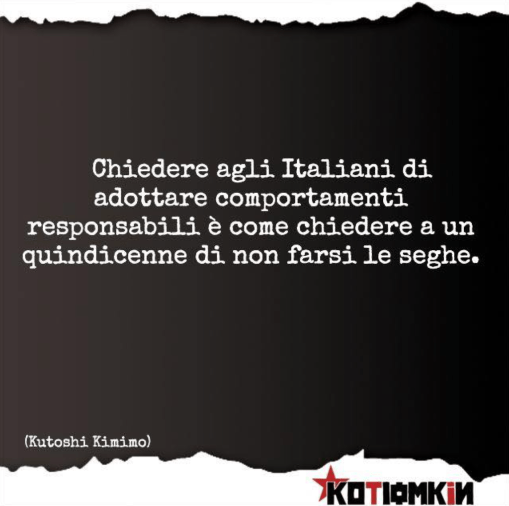 Una persona a me vicina lavora in un supermercato. È uno dei posti che (ovviamente) non verrà chiuso in queste settimane. Mi racconta scene aberranti di comune inciviltà quotidiana. A fronte di tante persone garbate, che rispettano distanza minima e regole, ce ne sono tante (troppe) altre che trattano i commessi come servi. Che non hanno rispetto. E che si incazzano se gli fai notare che devono mettere i guanti quando scelgono frutta e verdura (“E che li metto a fare, mica si mangia la buccia delle banane?”). È gente così, di ogni età: “magari” fossero solo giovani coglioni.