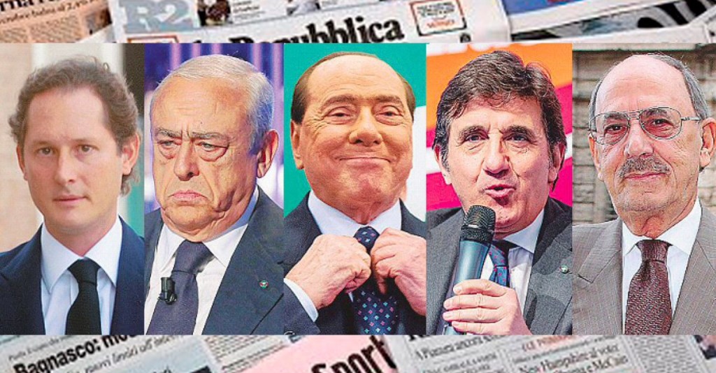 Ben noti sono poi i casi del Sole 24 Ore, espressione di Confindustria, e della famiglia Berlusconi, che attraverso Fininvest controlla Mediaset, Il Giornale, decine di riviste e diverse radio, tra cui R101 e Radio 105. Da tempo pare che Urbano Cairo, editore di La7 e di Rcs (Corriere della Sera) debba seguire le orme di B., cercando fortuna in politica dopo averla trovata sui media e nel mondo del calcio. L’idea potrebbe tornare di moda.