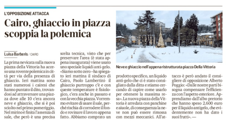 La prima nevicata sulla nuova piazza della Vittoria ha acceso una rovente polemica in città per via della presenza di ghiaccio. Ieri mattina sono stati numerosi i cairesi che hanno puntato il dito, trovandosi ad attraversare una piazza dove alle 10 c’era ancora neve e ghiaccio, che si è poi sciolto nel primo pomeriggio. Nel mirino è finita l’assenza di sale, che però è una precisa scelta tecnica, visto che per preservare l’area (è stata appena inaugurata) viene usato uno speciale liquidi anti-gelo. «Siamo sotto zero -ha spiegato ieri mattina il sindaco di Cairo, Paolo Lambertini- il ghiaccio purtroppo c’è e con queste temperature è fisiologico, c’era anche in passato e con la vecchia piazza. Vorremmo evitare di usare il sale, perché rischia di corrodere il fondo e rovinare il lavoro appena fatto. Abbiamo comprato un prodotto specifico, un liquido anti-gelo che ci è stato consigliato dalla ditta e stiamo cercando di capire come usarlo per ottenere la massima resa». La nuova piazza della Vittoria è arredata con panchine e aiuole, di conseguenza la neve non può essere rimossa con mezzi meccanici. All’attacco è però andato il consigliere di opposizione Alberto Poggio: «Dalle nostre parti bisogna compensare l’efficienza con l’aspetto esteriore. Apprendiamo dall’albo pretorio che hanno speso 2.600 euro per il liquido antigelo, che evidentemente non ha dato i suoi frutti». —