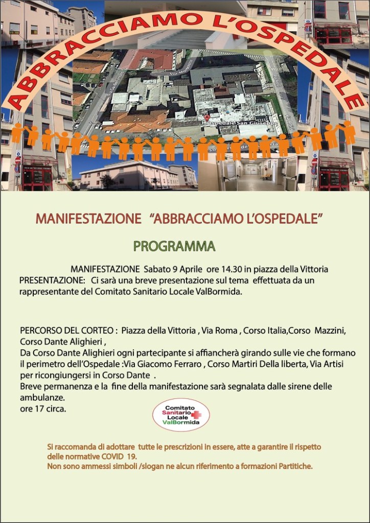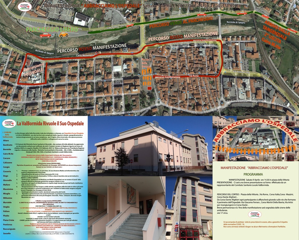 La protesta inizierà alle 14:30 in piazza della Vittoria, a Cairo, dove sono previsti alcuni interventi sul palco. Poi partirà il corteo che si snoderà in: via Roma, corso Italia, corso Mazzini, corso Dante Alighieri. Da corso Dante Alighieri ogni partecipante si affiancherà, girando sulle vie che formano il perimetro dell’ospedale: via Giuseppe Ferraro, corso Martiri della Libertà e via Artisi per ricongiungersi in corso Dante, dove è prevista una breve permanenza. La manifestazione dovrebbe concludersi intorno alle 17.