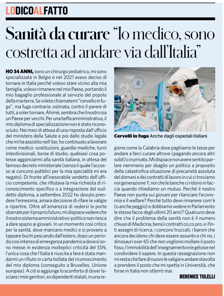 Ho 34 anni, sono un chirurgo pediatrico, mi sono specializzata in Belgio e nel 2021 avevo deciso di tornare in Italia perché volevo stare vicino alla mia famiglia, volevo rimanere nel mio Paese, portando il mio bagaglio professionale al servizio del popolo della mia terra. Se volete chiamatemi “cervello in fuga”, ma fuga contraria: ostinata, contro il parere di tutti, a voler tornare. Ahimè, sembra che il nostro sia un Paese per vecchi. Per una beffa amministrativa, il mio diploma di specializzazione non è stato riconosciuto. Nei mesi di attesa di una risposta dall’ufficio del ministero della Salute e poi dallo studio legale che mi ha assistito nell’iter, ho continuato a lavorare come medico: sostituzioni, guardie mediche, turni interdivisionali, borse di studio, qualsiasi cosa potesse agganciarmi alla sanità italiana, in attesa del famoso decreto ministeriale (senza il quale l’accesso ai concorsi pubblici per la mia specialità mi era negato). Di fronte all’inesorabile verdetto dell’ufficio competente, che rifiutava la mia richiesta di riconoscimento specifico o a integrazione del suddetto diploma, a settembre 2022 ho dovuto prendere l’ennesima, amara decisione di rifare le valigie e ripartire. Oltre all’amarezza di vedersi le porte sbarrate per il proprio futuro, mi dispiace vedere che il nostro sistema amministrativo-politico non riesca a dare spazio ai giovani. In un momento così critico per la sanità, dove mancano medici e si provano a tappare buchi pescando dall’estero, dopo un periodo cosi intenso di emergenza pandemica dove si sono messe in evidenza molteplici criticità del SSN, l’unica cosa che l’Italia è riuscita a fare è stata mandarmi un rifiuto in carta bollata del riconoscimento del mio diploma (conseguito a Bruxelles, Unione europea). A ciò si aggiunge lo sconforto di dover lasciare i miei genitori, ex dipendenti statali, in una regione come la Calabria dove paghiamo le tasse per andare a farci curare altrove (pagando ancora altri soldi) o in privato. Mi dispiace non avere sentito parlare nemmeno per sbaglio un politico a proposito della catastrofica situazione di precarietà assoluta del domani e dei contratti di lavoro in cui ci troviamo noi generazione Y, noi che le banche ci ridono in faccia quando chiediamo un mutuo. Perché il nostro Paese non punta sui giovani per rilanciare l’economia e il welfare? Perché tutto deve rimanere com’è (o anche peggio) e dobbiamo vedere in Parlamento le stesse facce degli ultimi 20 anni? Qualcuno deve dire che il problema della sanità non è il numero chiuso di Medicina, bensì i contratti co.co.pro. e i finti assegni di ricerca, i concorsi truccati, i baroni che ancora decidono chi deve essere assunto e chi no, i dinosauri over 65 che non vogliono mollare il posto fisso, l’immobilità dell’insegnamento e le gelosie nel condividere il sapere. In questa rassegnazione non mi resta che fare di nuovo le valigie e andare stavolta a prendere il posto che mi spetta in Università, che forse in Italia non otterrò mai.Berenice Tulelli