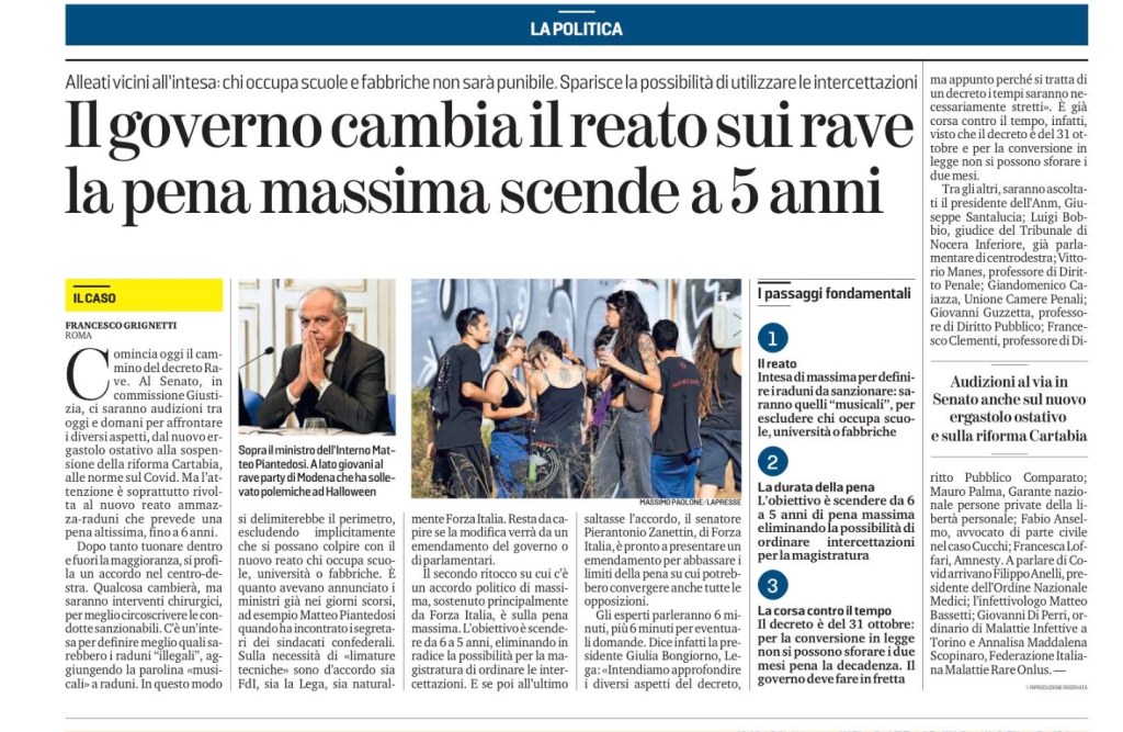 Comincia oggi il cammino del decreto Rave. Al Senato, in commissione Giustizia, ci saranno audizioni tra oggi e domani per affrontare i diversi aspetti, dal nuovo ergastolo ostativo alla sospensione della riforma Cartabia, alle norme sul Covid. Ma l’attenzione è soprattutto rivolta al nuovo reato ammazza-raduni che prevede una pena altissima, fino a 6 anni.