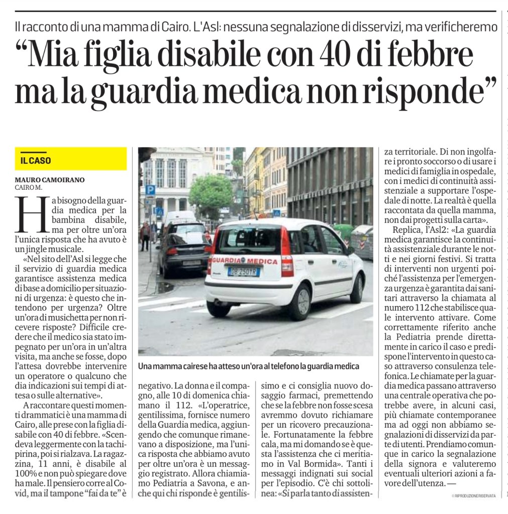 A raccontare questi momenti drammatici è una mamma di Cairo, alle prese con la figlia disabile con 40 di febbre. «Scendeva leggermente con la tachipirina, poi si rialzava. La ragazzina, 11 anni, è disabile al 100% e non può spiegare dove ha male. Il pensiero corre al Covid, ma il tampone “fai da te” è negativo. La donna e il compagno, alle 10 di domenica chiamano il 112. «L’operatrice, gentilissima, fornisce numero della Guardia medica, aggiungendo che comunque rimanevano a disposizione, ma l’unica risposta che abbiamo avuto per oltre un’ora è un messaggio registrato. Allora chiamiamo Pediatria a Savona, e anche qui chi risponde è gentilissimo e ci consiglia nuovo dosaggio farmaci, premettendo che se la febbre non fosse scesa avremmo dovuto richiamare per un ricovero precauzionale. Fortunatamente la febbre cala, ma mi domando se è questa l’assistenza che ci meritiamo in Val Bormida». Tanti i messaggi indignati sui social per l’episodio. C’è chi sottolinea: «Si parla tanto di assistenza territoriale. Di non ingolfare i pronto soccorso o di usare i medici di famiglia in ospedale, con i medici di continuità assistenziale a supportare l’ospedale di notte. La realtà è quella raccontata da quella mamma, non dai progetti sulla carta».