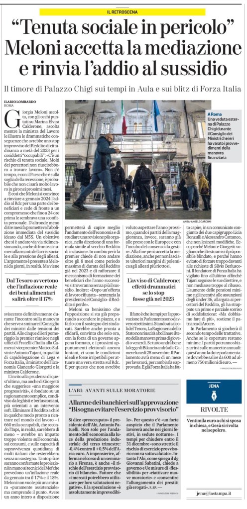 Giorgia Meloni ascolta, con gli occhi puntati su Marina Elvira Calderone, ascolta mentre la ministra del Lavoro le illustra le drammatiche conseguenze che avrebbe uno stop improvviso del Reddito di cittadinanza a metà del 2023 per i cosiddetti “occupabili”: «C’è un rischio di tenuta sociale. Molti dei percettori non riuscirebbero a trovare lavoro». Non c’è tempo, e con il Paese che è sulla soglia della recessione, è probabile che non ci sarà molto lavoro in giro nei prossimi mesi.