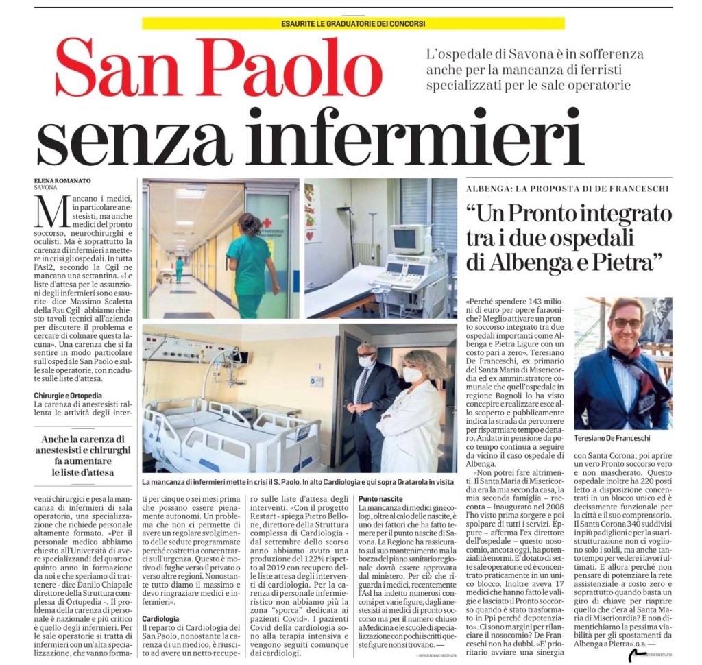 Mancano i medici, in particolare anestesisti, ma anche medici del pronto soccorso, neurochirurghi e oculisti. Ma è soprattutto la carenza di infermieri a mettere in crisi gli ospedali. In tutta l’Asl2, secondo la Cgil ne mancano una settantina. «Le liste d’attesa per le assunzioni degli infermieri sono esaurite- dice Massimo Scaletta della Rsu Cgil – abbiamo chiesto tavoli tecnici all’azienda per discutere il problema e cercare di colmare questa lacuna». Una carenza che si fa sentire in modo particolare sull’ospedale San Paolo e sulle sale operatorie, con ricadute sulle liste d’attesa.