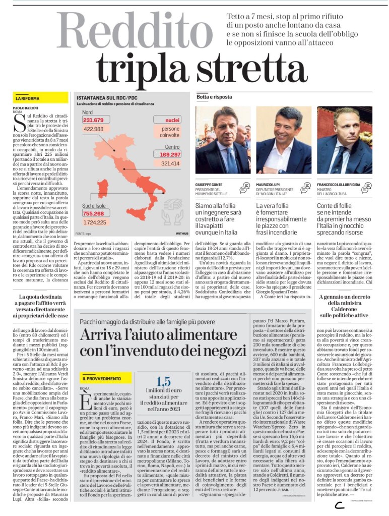 A Conte ieri ha risposto innanzitutto Lupi secondo il quale «la vera follia non è aver eliminato la parola “congrua”, che vuol dire tutto e niente, ma negare il diritto al lavoro, scommettere sulla povertà delle persone e fomentare irresponsabilmente le piazze con dichiarazioni incendiarie. Chi non può lavorare continuerà a percepire il reddito, ma la lotta alla povertà si vince creando occupazione e, per questo abbiamo trovato fondi per sostenere le assunzioni dei giovani». Anche il ministro dell’Agricoltura Francesco Lollobrigida a sua volta ha preso di petto Conte sostenendo «che lui di follie se ne intende perché ne è stato protagonista per tutti questi anni nei quali l’Italia è stata messa in ginocchio, senza una strategia e con una dispersione di risorse».