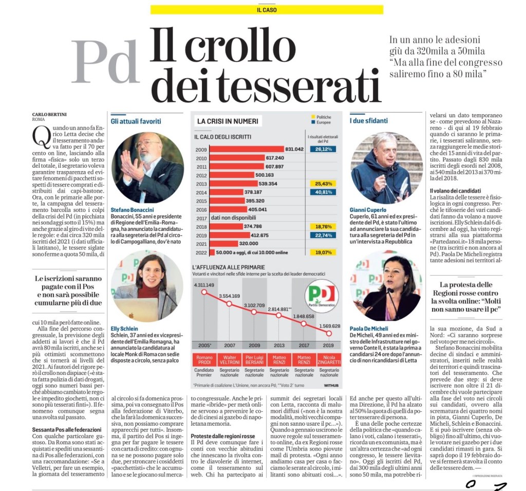 Quando un anno fa Enrico Letta decise che il tesseramento andava fatto per il 70 per cento on line, lasciando alla firma «fisica» solo un terzo del totale, il segretario voleva garantire trasparenza ed evitare fenomeni di pacchetti sospetti di tessere comprati e distribuiti dai capi-bastone. Ora, con le primarie alle porte, la campagna del tesseramento barcolla sotto i colpi della crisi del Pd (in picchiata nei sondaggi sotto il 15%) ma anche grazie al giro di vite delle regole: e dai circa 320 mila iscritti del 2021 (i dati ufficiali latitano), le tessere siglate sono ferme a quota 50 mila, di cui 10 mila però fatte online.