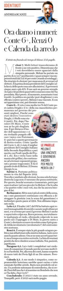 Letta 1,5. Il leader (eh?) del Pd ha battuto ogni record immaginabile di suicidi e cazzate negli ultimi sei mesi, e se avremo per anni il governo Meloni è anche e soprattutto colpa sua. Brava persona, ma totalmente inadeguata al ruolo, oltremodo colpevole in non pochi casi (l’appoggio a Di Maio, la guerra santa a Conte) e destinato a essere ricordato come il più grande Attila involontario (involontario?) del centrosinistra nostrano.