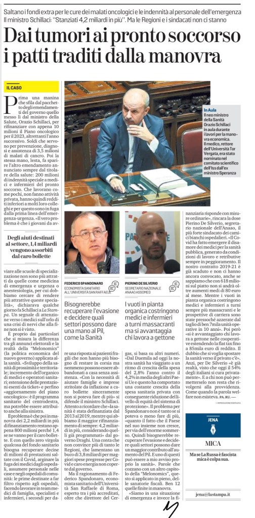Prima una manina che sfila dal pacchetto degli emendamenti del governo quello messo lì dal ministro della Salute, Orazio Schillaci, per rifinanziare con appena 10 milioni il Piano oncologico per il 2023, altrettanti l’anno successivo. Soldi che servono per prevenzione, diagnosi e assistenza di 3,5 milioni di malati di cancro. Poi la stessa mano, lesta, fa sparire l’altro emendamento annunciato sempre dal titolare della salute: 200 milioni di indennità speciale a medici e infermieri del pronto soccorso. Che lavorano come pochi, non fanno attività privata, hanno quindi redditi inferiori a molti loro colleghi e per questo sono in fuga dalla prima linea dell’emergenza-urgenza. «Il vero problema è che i giovani da avviare alle scuole di specializzazione non sono più attratti da quelle come medicina di emergenza e urgenza o anestesiologia, per cui dobbiamo cercare di rendere più attrattive queste specialità», dichiarava qualche giorno fa Schillaci a La Stampa. Un segnale di attenzione verso i medici sull’orlo di una crisi di nervi che alla fine non si è visto.