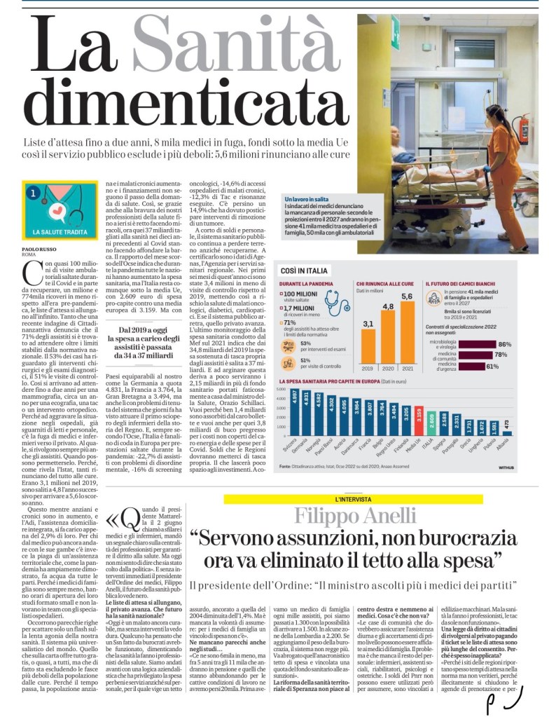 Occorrono parecchie righe per scattare solo un flash sulla lenta agonia della nostra sanità. Il sistema più universalistico del mondo. Quello che sulla carta offre tutto gratis, o quasi, a tutti, ma che di fatto sta escludendo le fasce più deboli della popolazione dalle cure. Perché il tempo passa, la popolazione anziana e i malati cronici aumentano e i finanziamenti non seguono il passo della domanda di salute. Così, se grazie anche alla bravura dei nostri professionisti della salute fino a ieri si è retto facendo miracoli, ora quei 37 miliardi tagliati alla sanità nei dieci anni precedenti al Covid stanno facendo affondare la barca. Il rapporto del mese scorso dell’Ocse indica che durante la pandemia tutte le nazioni hanno aumentato la spesa sanitaria, ma l’Italia resta comunque sotto la media Ue, con 2.609 euro di spesa pro-capite contro una media europea di 3.159. Ma con Paesi equiparabili al nostro come la Germania a quota 4.831, la Francia a 3.764, la Gran Bretagna a 3.494, ma anche lì con problemi di tenuta del sistema che giorni fa ha visto attuare il primo sciopero degli infermieri della storia del Regno. E, sempre secondo l’Ocse, l’Italia è fanalino di coda in Europa per prestazioni saltate durante la pandemia: -22,7% di assistiti con problemi di disordine mentale, -16% di screening oncologici, -14,6% di accessi ospedalieri di malati cronici, -12,3% di Tac e risonanze eseguite. C’è persino un 14,9% che ha dovuto posticipare interventi di rimozione di un tumore.