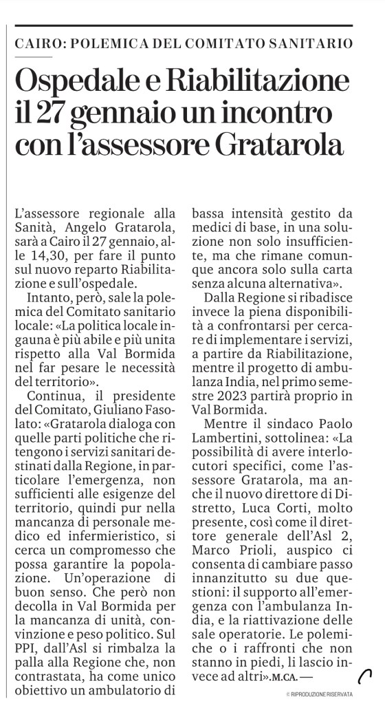 L’assessore regionale alla Sanità, Angelo Gratarola, sarà a Cairo il 27 gennaio, alle 14,30, per fare il punto sul nuovo reparto Riabilitazione e sull’ospedale.