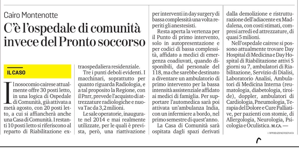 Il nosocomio cairese attualmente offre 30 posti letto, in una logica di Ospedale di Comunità, già attivata a metà agosto, con 20 posti letto, a cui si affiancherà anche una Casa di Comunità. I restanti 10 posti letto si riferiscono al reparto di Riabilitazione extraospedaliera residenziale.