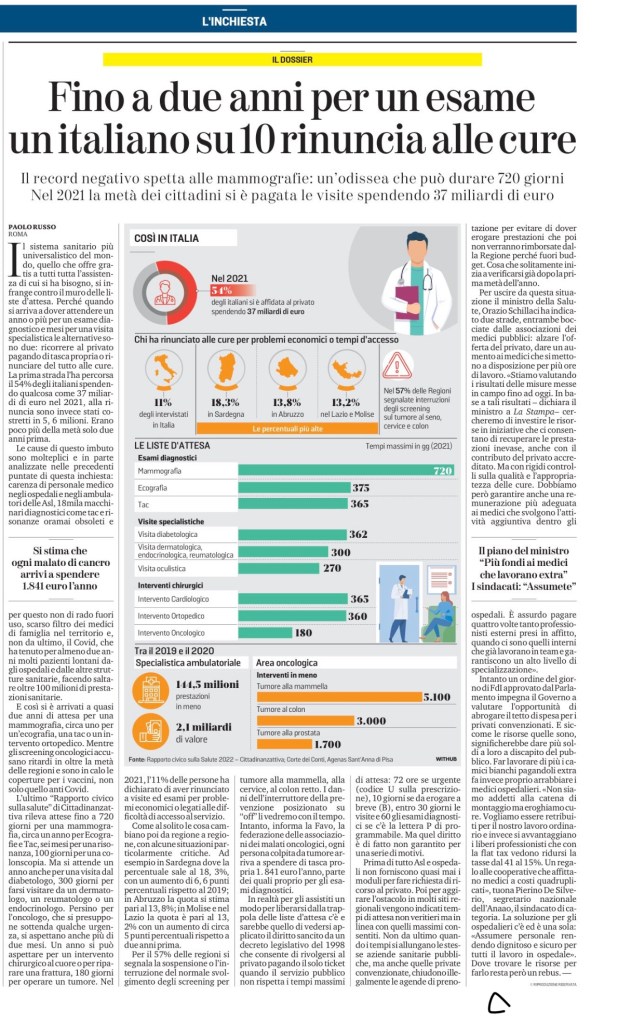 L’ultimo “Rapporto civico sulla salute” di Cittadinanzattiva rileva attese fino a 720 giorni per una mammografia, circa un anno per Ecografie e Tac, sei mesi per una risonanza, 100 giorni per una colonscopia. Ma si attende un anno anche per una visita dal diabetologo, 300 giorni per farsi visitare da un dermatologo, un reumatologo o un endocrinologo. Persino per l’oncologo, che si presuppone sottenda qualche urgenza, si aspettano anche più di due mesi. Un anno si può aspettare per un intervento chirurgico al cuore o per riparare una frattura, 180 giorni per operare un tumore. Nel 2021, l’11% delle persone ha dichiarato di aver rinunciato a visite ed esami per problemi economici o legati alle difficoltà di accesso al servizio.