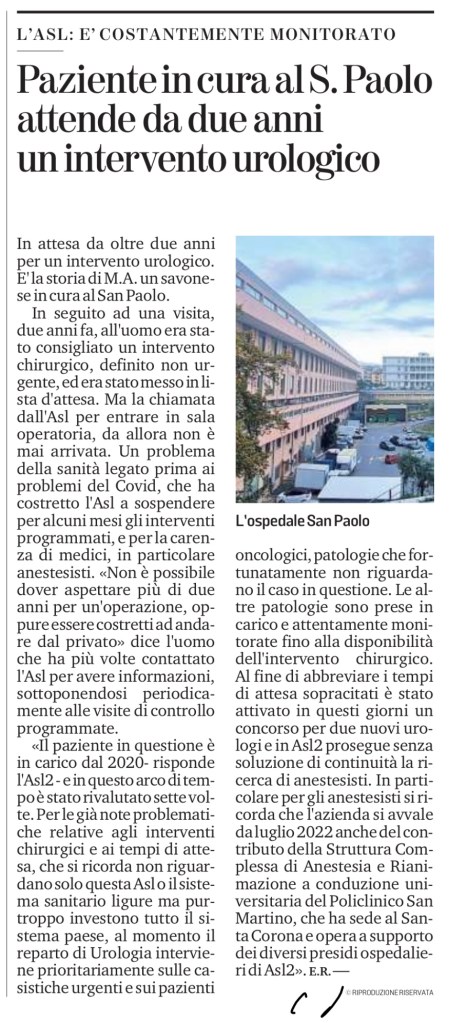 «Il paziente in questione è in carico dal 2020- risponde l’Asl2 – e in questo arco di tempo è stato rivalutato sette volte. Per le già note problematiche relative agli interventi chirurgici e ai tempi di attesa, che si ricorda non riguardano solo questa Asl o il sistema sanitario ligure ma purtroppo investono tutto il sistema paese, al momento il reparto di Urologia interviene prioritariamente sulle casistiche urgenti e sui pazienti oncologici, patologie che fortunatamente non riguardano il caso in questione. Le altre patologie sono prese in carico e attentamente monitorate fino alla disponibilità dell’intervento chirurgico. Al fine di abbreviare i tempi di attesa sopracitati è stato attivato in questi giorni un concorso per due nuovi urologi e in Asl2 prosegue senza soluzione di continuità la ricerca di anestesisti. In particolare per gli anestesisti si ricorda che l’azienda si avvale da luglio 2022 anche del contributo della Struttura Complessa di Anestesia e Rianimazione a conduzione universitaria del Policlinico San Martino, che ha sede al Santa Corona e opera a supporto dei diversi presidi ospedalieri di Asl2». e.r.