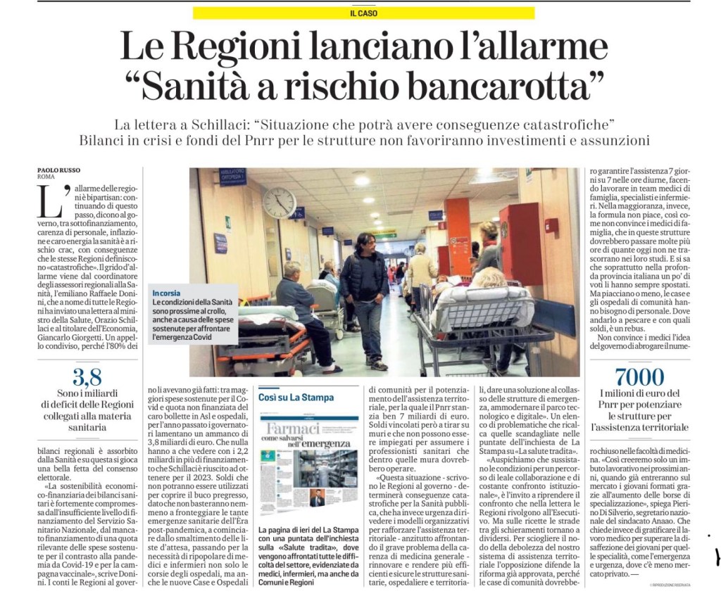 «Questa situazione – scrivono le Regioni al governo – determinerà conseguenze catastrofiche per la Sanità pubblica, che ha invece urgenza di rivedere i modelli organizzativi per rafforzare l’assistenza territoriale – anzitutto affrontando il grave problema della carenza di medicina generale – rinnovare e rendere più efficienti e sicure le strutture sanitarie, ospedaliere e territoriali, dare una soluzione al collasso delle strutture di emergenza, ammodernare il parco tecnologico e digitale». Un elenco di problematiche che ricalca quelle scandagliate nelle puntate dell’inchiesta de La Stampa su «La salute tradita».