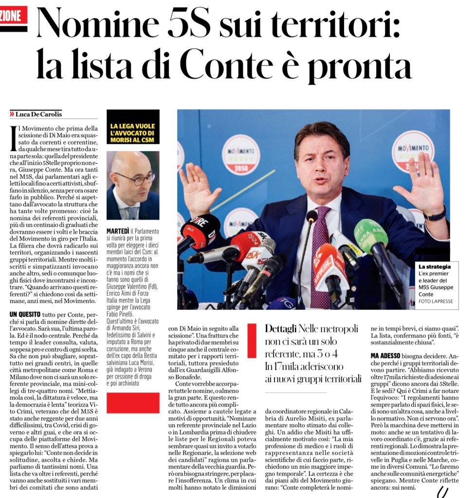 Ma adesso bisogna decidere. Anche perché i gruppi territoriali devono partire. “Abbiamo ricevuto oltre 17mila richieste di adesione ai gruppi” dicono ancora dai 5Stelle. E le sedi? Qui è Crimi a far notare l’equivoco: “I regolamenti hanno sempre parlato di spazi fisici, le sedi sono un’altra cosa, anche a livello normativo. Non ci servono ora”. Però la macchina deve mettersi in moto: anche se un tentativo di lavoro coordinato c’è, grazie ai referenti regionali. Lo dimostra la presentazione di mozioni contro le trivelle in Puglia e nelle Marche, come in diversi Comuni. “Lo faremo anche sulle comunità energetiche” spiegano. Mentre Conte riflette ancora: sui nomi.