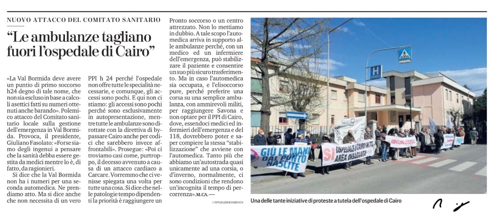 «La Val Bormida deve avere un puntio di primo soccorso h24 degno di tale nome, che non sia escluso in base a calcoli asettici fatti su numeri ottenuti anche barando». Polemico attacco del Comitato sanitario locale sulla gestione dell’emergenza in Val Bormida. Provoca, il presidente, Giuliano Fasolato: «Forse siamo degli ingenui a pensare che la sanità debba essere gestita da medici mentre lo è, di fatto, da ragionieri.