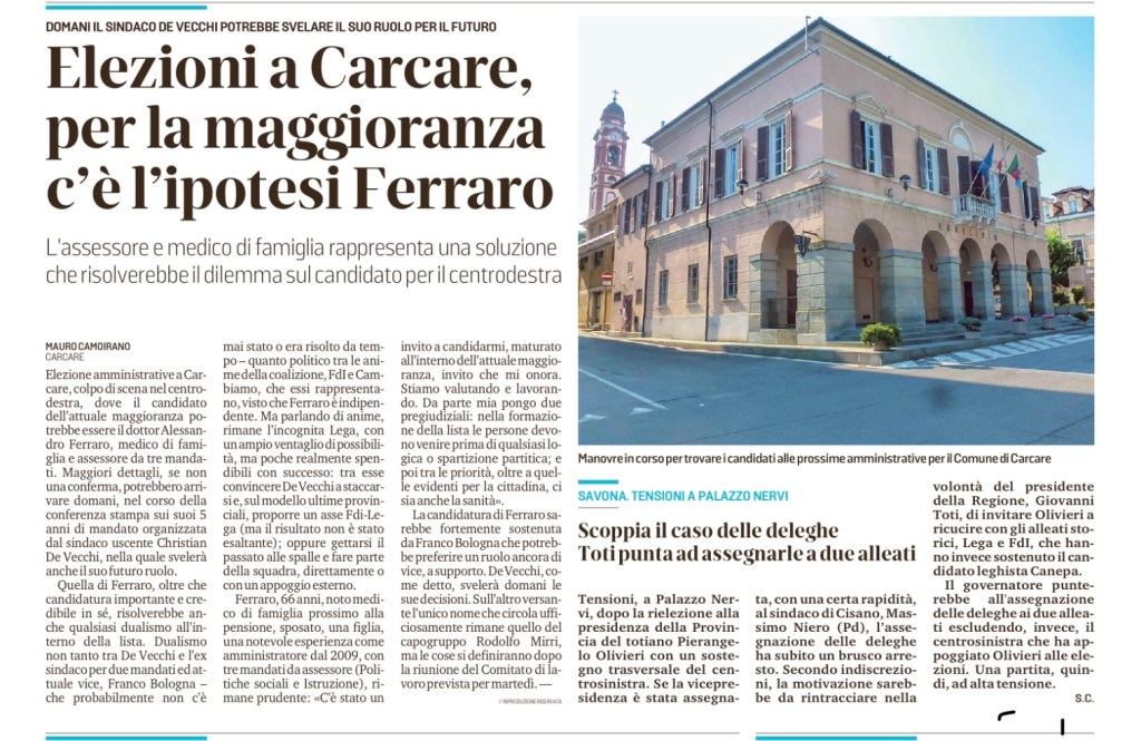 Elezione amministrative a Carcare, colpo di scena nel centrodestra, dove il candidato dell’attuale maggioranza potrebbe essere il dottor Alessandro Ferraro, medico di famiglia e assessore da tre mandati. Maggiori dettagli, se non una conferma, potrebbero arrivare domani, nel corso della conferenza stampa sui suoi 5 anni di mandato organizzata dal sindaco uscente Christian De Vecchi, nella quale svelerà anche il suo futuro ruolo.
