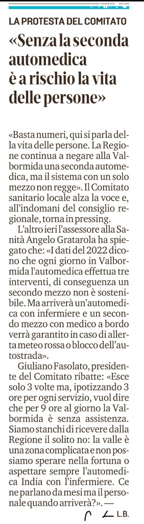 L’altro ieri l’assessore alla Sanità Angelo Gratarola ha spiegato che: «I dati del 2022 dicono che ogni giorno in Valbormida l’automedica effettua tre interventi, di conseguenza un secondo mezzo non è sostenibile. Ma arriverà un’automedica con infermiere e un secondo mezzo con medico a bordo verrà garantito in caso di allerta meteo rossa o blocco dell’autostrada».