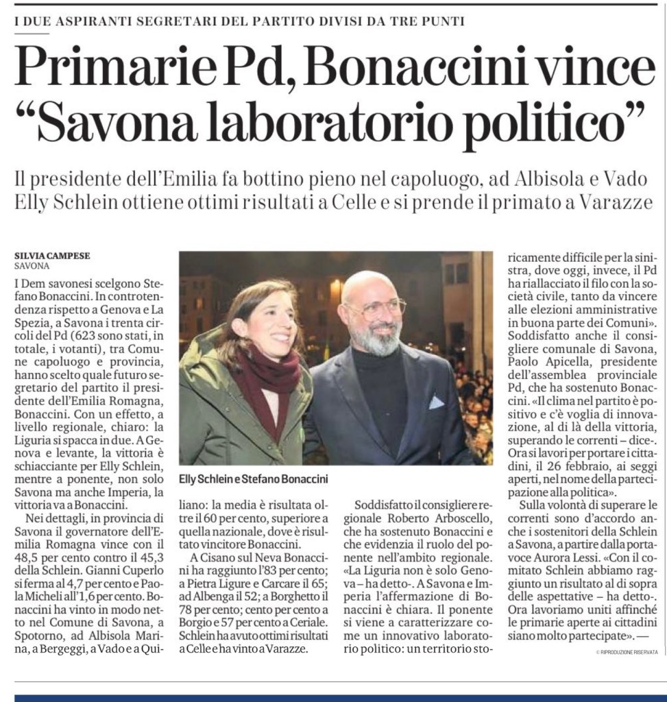 Nei dettagli, in provincia di Savona il governatore dell’Emilia Romagna vince con il 48,5 per cento contro il 45,3 della Schlein. Gianni Cuperlo si ferma al 4,7 per cento e Paola Micheli all’1,6 per cento. Bonaccini ha vinto in modo netto nel Comune di Savona, a Spotorno, ad Albisola Marina, a Bergeggi, a Vado e a Quiliano: la media è risultata oltre il 60 per cento, superiore a quella nazionale, dove è risultato vincitore Bonaccini.