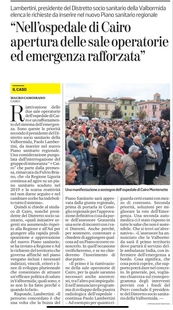 Riattivazione delle due sale operatorie dell’ospedale di Cairo e un rafforzamento del sistema dell’emergenza. Sono queste le priorità secondo il presidente del Distretto socio sanitario della Valbormida, Paolo Lambertini, da inserire nel nuovo Piano sanitario regionale. Una considerazione pungolata dall’interrogazione del gruppo di minoranza “+Cairo” che parte dalla premessa, rimarcata da Fulvio Briano, che «la Regione Liguria continua ad agire su un piano sanitario scaduto nel 2019 e la scarsa reattività nel non darne seguito e nel cambiare scelte ha indebolito tutto il sistema».