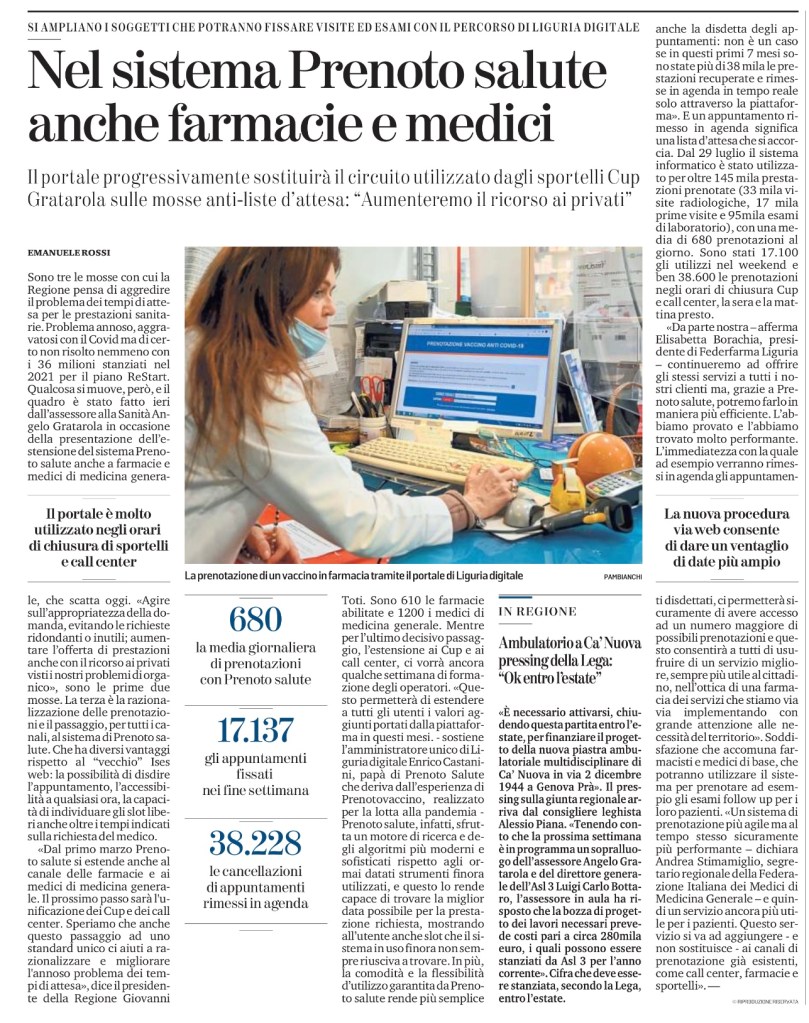 «Dal primo marzo Prenoto salute si estende anche al canale delle farmacie e ai medici di medicina generale. Il prossimo passo sarà l’unificazione dei Cup e dei call center. Speriamo che anche questo passaggio ad uno standard unico ci aiuti a razionalizzare e migliorare l’annoso problema dei tempi di attesa», dice il presidente della Regione Giovanni Toti. Sono 610 le farmacie abilitate e 1200 i medici di medicina generale. Mentre per l’ultimo decisivo passaggio, l’estensione ai Cup e ai call center, ci vorrà ancora qualche settimana di formazione degli operatori. «Questo permetterà di estendere a tutti gli utenti i valori aggiunti portati dalla piattaforma in questi mesi. – sostiene l’amministratore unico di Liguria digitale Enrico Castanini, papà di Prenoto Salute che deriva dall’esperienza di Prenotovaccino, realizzato per la lotta alla pandemia – Prenoto salute, infatti, sfrutta un motore di ricerca e degli algoritmi più moderni e sofisticati rispetto agli ormai datati strumenti finora utilizzati, e questo lo rende capace di trovare la miglior data possibile per la prestazione richiesta, mostrando all’utente anche slot che il sistema in uso finora non sempre riusciva a trovare. In più, la comodità e la flessibilità d’utilizzo garantita da Prenoto salute rende più semplice anche la disdetta degli appuntamenti: non è un caso se in questi primi 7 mesi sono state più di 38 mila le prestazioni recuperate e rimesse in agenda in tempo reale solo attraverso la piattaforma». E un appuntamento rimesso in agenda significa una lista d’attesa che si accorcia. Dal 29 luglio il sistema informatico è stato utilizzato per oltre 145 mila prestazioni prenotate (33 mila visite radiologiche, 17 mila prime visite e 95mila esami di laboratorio), con una media di 680 prenotazioni al giorno. Sono stati 17.100 gli utilizzi nel weekend e ben 38.600 le prenotazioni negli orari di chiusura Cup e call center, la sera e la mattina presto.