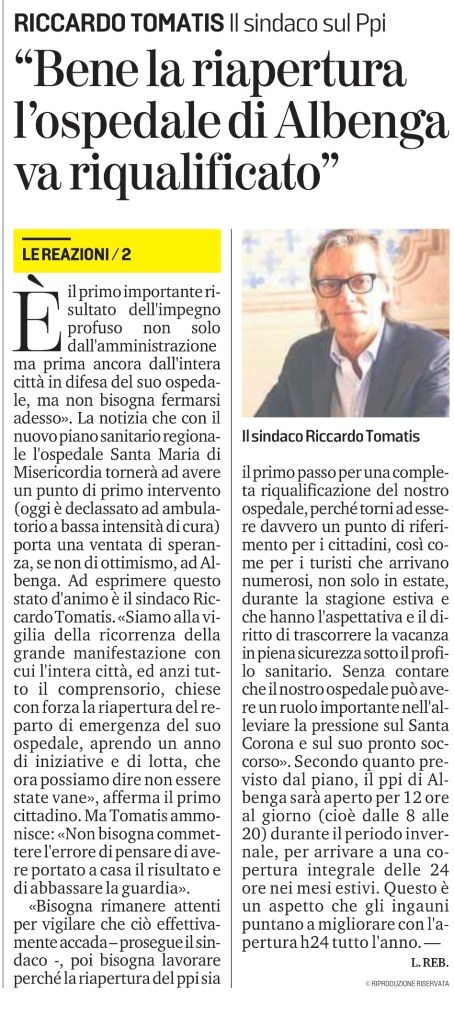 È il primo importante risultato dell’impegno profuso non solo dall’amministrazione ma prima ancora dall’intera città in difesa del suo ospedale, ma non bisogna fermarsi adesso». La notizia che con il nuovo piano sanitario regionale l’ospedale Santa Maria di Misericordia tornerà ad avere un punto di primo intervento (oggi è declassato ad ambulatorio a bassa intensità di cura) porta una ventata di speranza, se non di ottimismo, ad Albenga. Ad esprimere questo stato d’animo è il sindaco Riccardo Tomatis. «Siamo alla vigilia della ricorrenza della grande manifestazione con cui l’intera città, ed anzi tutto il comprensorio, chiese con forza la riapertura del reparto di emergenza del suo ospedale, aprendo un anno di iniziative e di lotta, che ora possiamo dire non essere state vane», afferma il primo cittadino. Ma Tomatis ammonisce: «Non bisogna commettere l’errore di pensare di avere portato a casa il risultato e di abbassare la guardia».