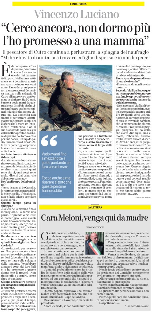 «Non ascoltate i Vigili del Fuoco. Io conosco come si muovono le correnti da queste parti. Tra 10 giorni i corpi usciranno fuori, la corrente li riporterà qui e io troverò la bambina che la mamma mi ha chiesto di cercare. Era qui sulla spiaggia, piangeva. Mi ha detto che aveva due figlie, una è morta, l’abbiamo trovata. L’altra risulta ancora dispersa. Avrà 4-5 anni, mi ha pregato di trovarla e io non avrò pace finché non avrò esaudito il desiderio di quella donna. Queste persone hanno il diritto ad avere almeno un corpo su cui piangere. Per me è un dovere, qualcosa che non posso non fare. Questa spiaggia è un po’ anche mia, anche se ci sono i soccorritori, quando sei un pescatore che è nato da queste parti conosci meglio come muoverti, dove andare. E io so che ora tocca a me occuparmi di riparare al torto che hanno subito queste persone». fla. ama. —