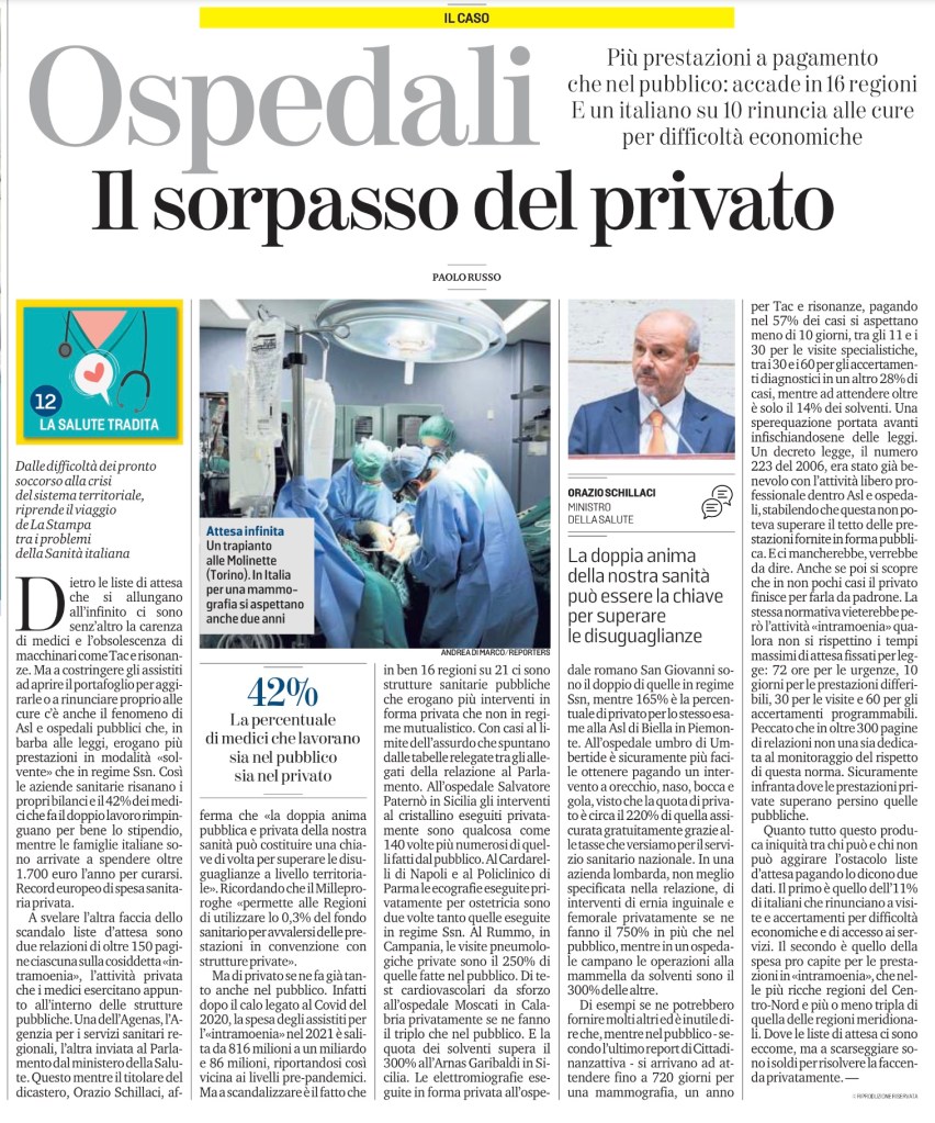 A svelare l’altra faccia dello scandalo liste d’attesa sono due relazioni di oltre 150 pagine ciascuna sulla cosiddetta «intramoenia», l’attività privata che i medici esercitano appunto all’interno delle strutture pubbliche. Una dell’Agenas, l’Agenzia per i servizi sanitari regionali, l’altra inviata al Parlamento dal ministero della Salute. Questo mentre il titolare del dicastero, Orazio Schillaci, afferma che «la doppia anima pubblica e privata della nostra sanità può costituire una chiave di volta per superare le disuguaglianze a livello territoriale». Ricordando che il Milleproroghe «permette alle Regioni di utilizzare lo 0,3% del fondo sanitario per avvalersi delle prestazioni in convenzione con strutture private».