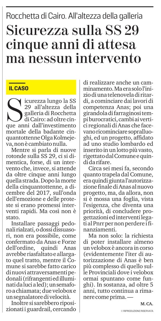 Sicurezza lungo la SS 29 all’altezza della galleria di Rocchetta di Cairo: ad oltre cinque anni dall’investimento mortale della badante cinquantottenne Olga Kolmejeva, non è cambiato nulla.