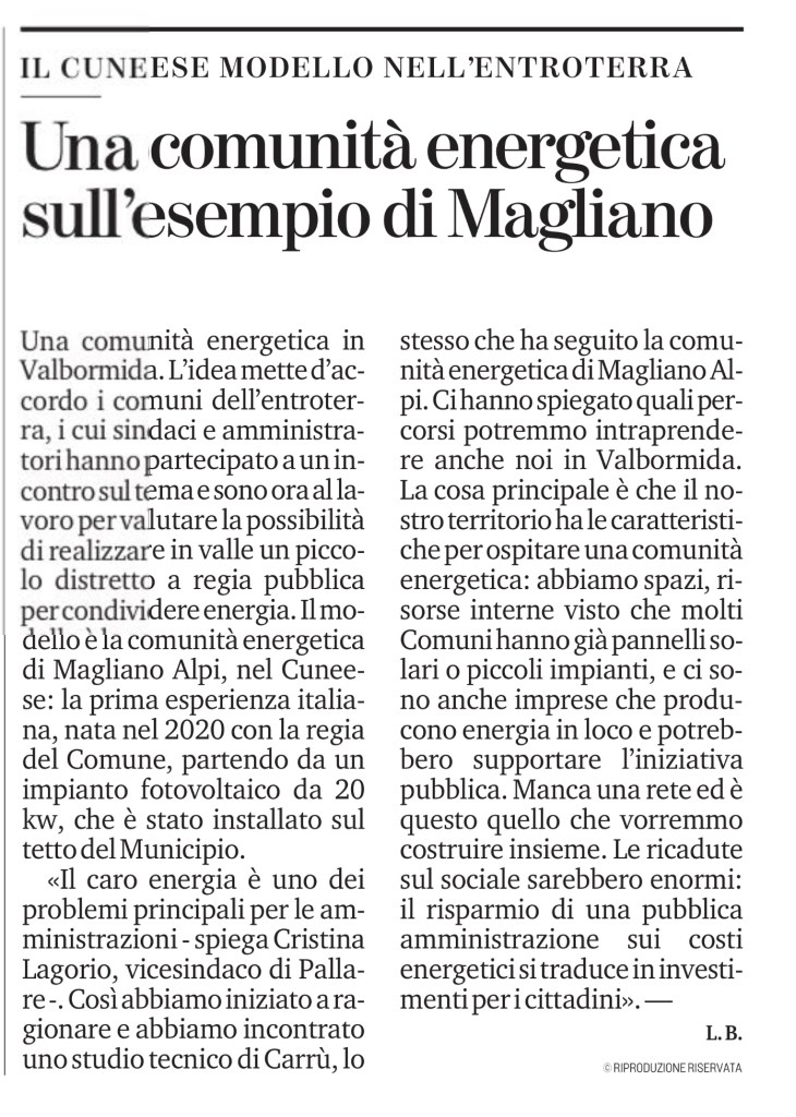 Una comunità energetica in Valbormida. L’idea mette d’accordo i comuni dell’entroterra, i cui sindaci e amministratori hanno partecipato a un incontro sul tema e sono ora al lavoro per valutare la possibilità di realizzare in valle un piccolo distretto a regia pubblica per condividere energia. Il modello è la comunità energetica di Magliano Alpi, nel Cuneese: la prima esperienza italiana, nata nel 2020 con la regia del Comune, partendo da un impianto fotovoltaico da 20 kw, che è stato installato sul tetto del Municipio.