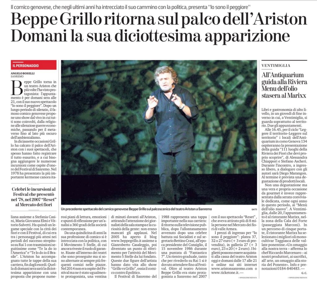 In diciassette occasioni Grillo ha calcato il palco dell’Ariston con i suoi spettacoli, che spesso hanno fatto registrare il tutto esaurito, e a cui bisogna aggiungere le numerose incursioni come ospite d’onore del Festival di Sanremo. Nel 1978 ha presentato la più importante kermesse canora italiana assieme a Stefania Casini, Maria Giovanna Elmi e Vittorio Salvetti. Ha quindi un legame speciale con la città dei fiori e con il Festival, di cui era tra i personaggi più attesi nei periodi del successo strepitoso su Rai 1 con trasmissioni seguitissime come “Te la do io l’America” e “Te lo do io il Brasile”. L’Ariston ha accompagnato tutte le tappe della sua carriera, fin dagli esordi. Quella di domani sera sarà la diciottesima apparizione con una proposta che propone numerosi piani di lettura, emozioni e spunti di riflessione per un’analisi a 360 gradi della società contemporanea.