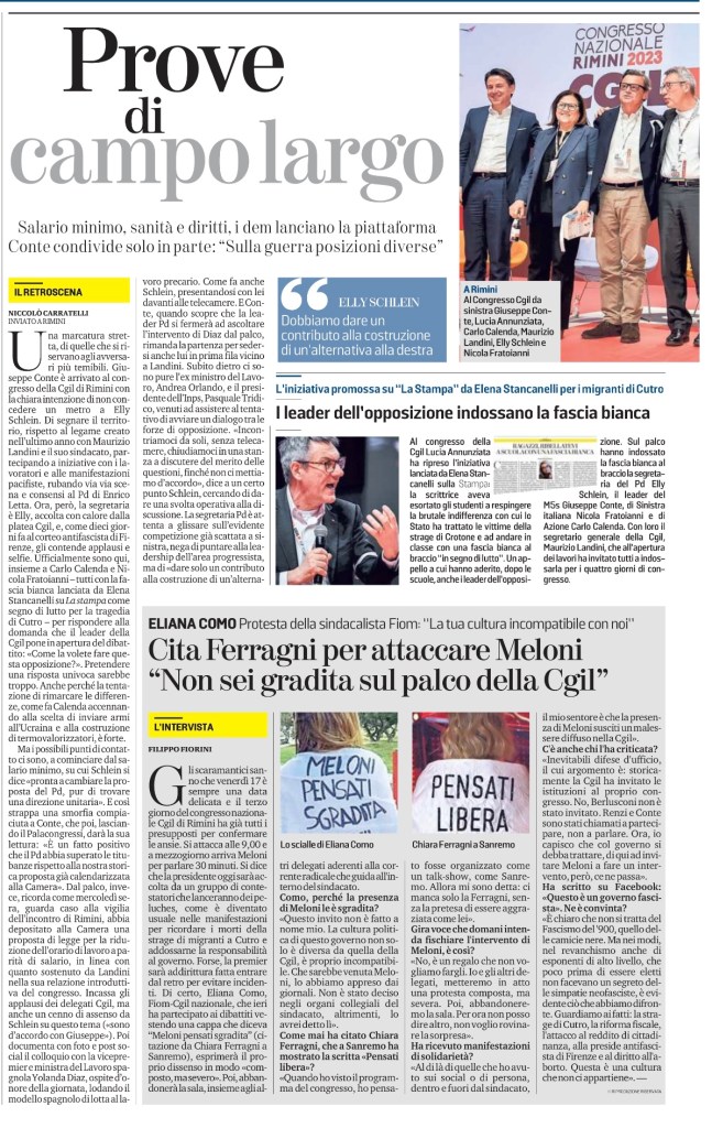Una marcatura stretta, di quelle che si riservano agli avversari più temibili. Giuseppe Conte è arrivato al congresso della Cgil di Rimini con la chiara intenzione di non concedere un metro a Elly Schlein. Di segnare il territorio, rispetto al legame creato nell’ultimo anno con Maurizio Landini e il suo sindacato, partecipando a iniziative con i lavoratori e alle manifestazioni pacifiste, rubando via via scena e consensi al Pd di Enrico Letta. Ora, però, la segretaria è Elly, accolta con calore dalla platea Cgil, e, come dieci giorni fa al corteo antifascista di Firenze, gli contende applausi e selfie. Ufficialmente sono qui, insieme a Carlo Calenda e Nicola Fratoianni – tutti con la fascia bianca lanciata da Elena Stancanelli su La stampa come segno di lutto per la tragedia di Cutro – per rispondere alla domanda che il leader della Cgil pone in apertura del dibattito: «Come la volete fare questa opposizione?». Pretendere una risposta univoca sarebbe troppo. Anche perché la tentazione di rimarcare le differenze, come fa Calenda accennando alla scelta di inviare armi all’Ucraina e alla costruzione di termovalorizzatori, è forte.