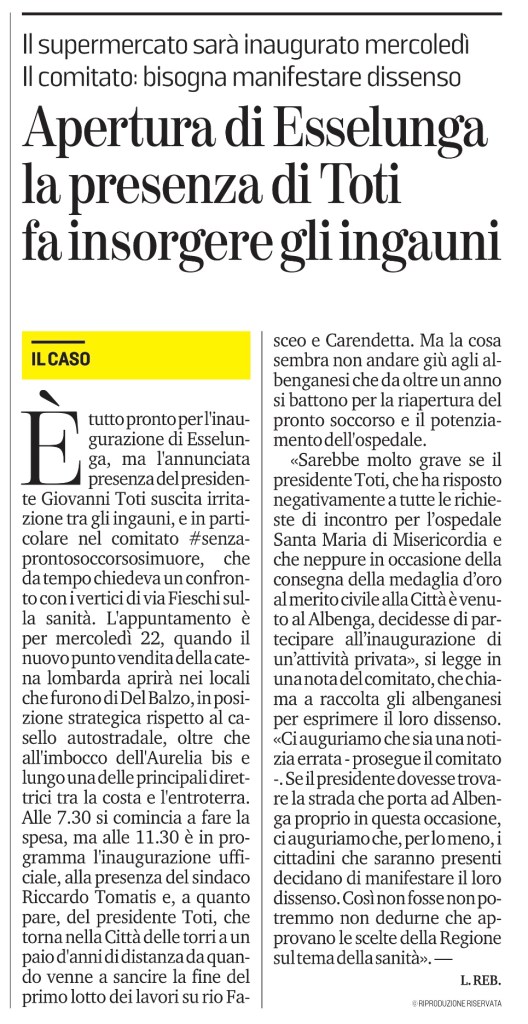 È tutto pronto per l’inaugurazione di Esselunga, ma l’annunciata presenza del presidente Giovanni Toti suscita irritazione tra gli ingauni, e in particolare nel comitato #senzaprontosoccorsosimuore, che da tempo chiedeva un confronto con i vertici di via Fieschi sulla sanità. L’appuntamento è per mercoledì 22, quando il nuovo punto vendita della catena lombarda aprirà nei locali che furono di Del Balzo, in posizione strategica rispetto al casello autostradale, oltre che all’imbocco dell’Aurelia bis e lungo una delle principali direttrici tra la costa e l’entroterra. Alle 7.30 si comincia a fare la spesa, ma alle 11.30 è in programma l’inaugurazione ufficiale, alla presenza del sindaco Riccardo Tomatis e, a quanto pare, del presidente Toti, che torna nella Città delle torri a un paio d’anni di distanza da quando venne a sancire la fine del primo lotto dei lavori su rio Fasceo e Carendetta. Ma la cosa sembra non andare giù agli albenganesi che da oltre un anno si battono per la riapertura del pronto soccorso e il potenziamento dell’ospedale.