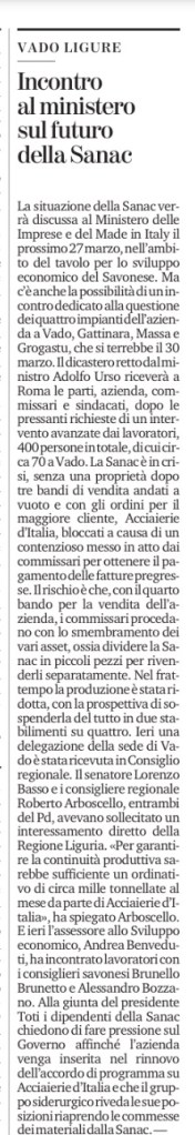 La situazione della Sanac verrà discussa al Ministero delle Imprese e del Made in Italy il prossimo 27 marzo, nell’ambito del tavolo per lo sviluppo economico del Savonese. Ma c’è anche la possibilità di un incontro dedicato alla questione dei quattro impianti dell’azienda a Vado, Gattinara, Massa e Grogastu, che si terrebbe il 30 marzo. Il dicastero retto dal ministro Adolfo Urso riceverà a Roma le parti, azienda, commissari e sindacati, dopo le pressanti richieste di un intervento avanzate dai lavoratori, 400 persone in totale, di cui circa 70 a Vado. La Sanac è in crisi, senza una proprietà dopo tre bandi di vendita andati a vuoto e con gli ordini per il maggiore cliente, Acciaierie d’Italia, bloccati a causa di un contenzioso messo in atto dai commissari per ottenere il pagamento delle fatture pregresse. Il rischio è che, con il quarto bando per la vendita dell’azienda, i commissari procedano con lo smembramento dei vari asset, ossia dividere la Sanac in piccoli pezzi per rivenderli separatamente. Nel frattempo la produzione è stata ridotta, con la prospettiva di sospenderla del tutto in due stabilimenti su quattro. Ieri una delegazione della sede di Vado è stata ricevuta in Consiglio regionale. Il senatore Lorenzo Basso e i consigliere regionale Roberto Arboscello, entrambi del Pd, avevano sollecitato un interessamento diretto della Regione Liguria. «Per garantire la continuità produttiva sarebbe sufficiente un ordinativo di circa mille tonnellate al mese da parte di Acciaierie d’Italia», ha spiegato Arboscello. E ieri l’assessore allo Sviluppo economico, Andrea Benveduti, ha incontrato lavoratori con i consiglieri savonesi Brunello Brunetto e Alessandro Bozzano. Alla giunta del presidente Toti i dipendenti della Sanac chiedono di fare pressione sul Governo affinché l’azienda venga inserita nel rinnovo dell’accordo di programma su Acciaierie d’Italia e che il gruppo siderurgico riveda le sue posizioni riaprendo le commesse dei materiali dalla Sanac. —