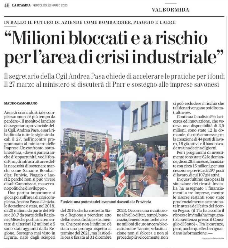 Area di crisi industriale complessa: «non c’è più tempo da perdere». Il monito è lanciato dal segretario provinciale della Cgil, Andrea Pasa, e sarà ribadito da tutte le sigle sindacali il 27, nell’incontro programmato al ministero delle Imprese. Un confronto, sottolinea Pasa, «dove si parlerà anche di opportunità, vedi i fondi Pnrr, di infrastrutture e della necessità di sostenere marchi come Sanac e Bombardier, Funivie, Piaggio e LaerH: perché non si può vivere di soli Commissari, ma servono politiche di sviluppo».