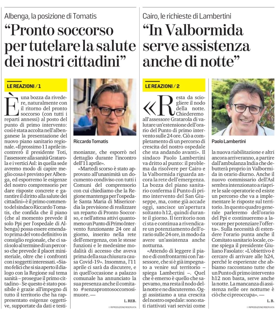 È una bozza da rivedere, naturalmente con il ritorno del pronto soccorso (con tutti i reparti annessi) al posto del punto di primo intervento: così è stata accolta nell’albenganese la presentazione del nuovo piano sanitario regionale. «Il prossimo 11 aprile incontrerò il presidente Toti, l’assessore alla sanità Gratarola e i vertici Asl: in quella sede avremo modo di capire meglio cosa è previsto per Albenga, ed esporremo le esigenze del nostro comprensorio per dare risposte concrete e garantire il diritto alla salute dei cittadini» è il primo commento del sindaco Riccardo Tomatis, che confida che il piano (che al momento prevede il solo Ppi per l’ospedale di Albenga) possa essere emendato prima del voto definitivo in consiglio regionale, che ci sarà solo al termine di un percorso che prevede il placet ministeriale, oltre che i confronti con i soggetti interessati. «Siamo felici che si sia aperto il dialogo con la Regione sul tema sanità – prosegue il primo cittadino – Se questo è stato possibile è grazie all’impegno di tutto il territorio che ha rappresentato esigenze oggettive, supportate da dati e testimonianze, che esporrò nel dettaglio durante l’incontro dell’11 aprile».