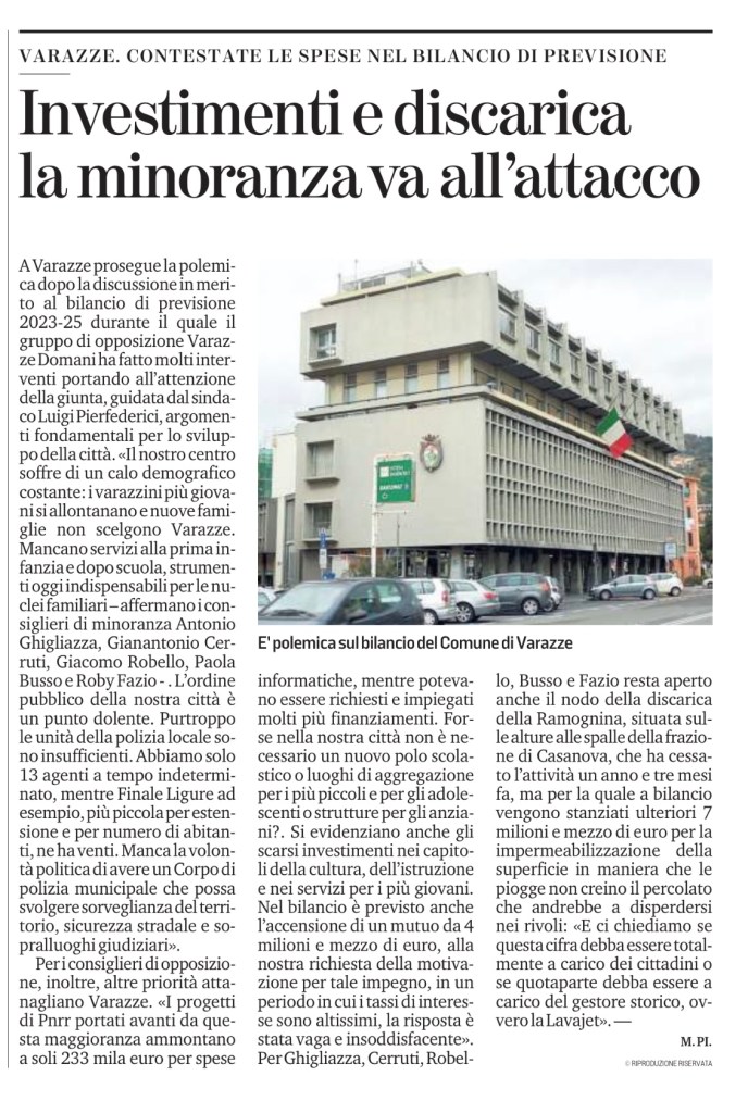 A Varazze prosegue la polemica dopo la discussione in merito al bilancio di previsione 2023-25 durante il quale il gruppo di opposizione Varazze Domani ha fatto molti interventi portando all’attenzione della giunta, guidata dal sindaco Luigi Pierfederici, argomenti fondamentali per lo sviluppo della città. «Il nostro centro soffre di un calo demografico costante: i varazzini più giovani si allontanano e nuove famiglie non scelgono Varazze. Mancano servizi alla prima infanzia e dopo scuola, strumenti oggi indispensabili per le nuclei familiari – affermano i consiglieri di minoranza Antonio Ghigliazza, Gianantonio Cerruti, Giacomo Robello, Paola Busso e Roby Fazio – . L’ordine pubblico della nostra città è un punto dolente. Purtroppo le unità della polizia locale sono insufficienti. Abbiamo solo 13 agenti a tempo indeterminato, mentre Finale Ligure ad esempio, più piccola per estensione e per numero di abitanti, ne ha venti. Manca la volontà politica di avere un Corpo di polizia municipale che possa svolgere sorveglianza del territorio, sicurezza stradale e sopralluoghi giudiziari».