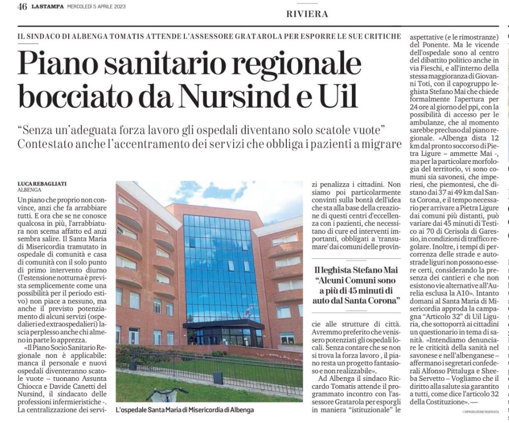 «Il Piano Socio Sanitario Regionale non è applicabile: manca il personale e nuovi ospedali diventeranno scatole vuote – tuonano Assunta Chiocca e Davide Canetti del Nursind, il sindacato delle professioni infermieristiche -. La centralizzazione dei servizi penalizza i cittadini. Non siamo poi particolarmente convinti sulla bontà dell’idea che sta alla base della creazione di questi centri d’eccellenza con i pazienti, che necessitano di cure ed interventi importanti, obbligati a ‘transumare’ dai comuni delle provincie alle strutture di città. Avremmo preferito che venissero potenziati gli ospedali locali. Senza contare che se non si trova la forza lavoro , il piano resta un progetto fantasioso e non realizzabile».