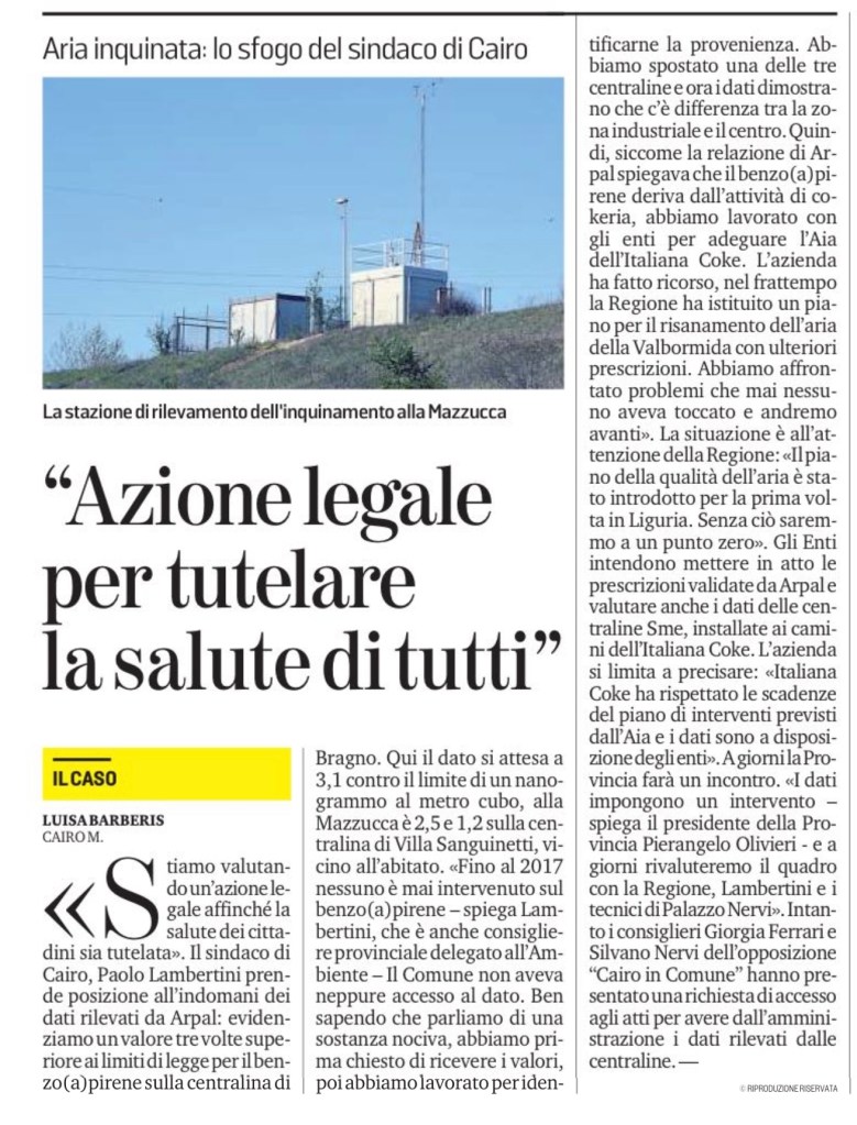 «Stiamo valutando un’azione legale affinché la salute dei cittadini sia tutelata». Il sindaco di Cairo, Paolo Lambertini prende posizione all’indomani dei dati rilevati da Arpal: evidenziamo un valore tre volte superiore ai limiti di legge per il benzo(a)pirene sulla centralina di Bragno. Qui il dato si attesa a 3,1 contro il limite di un nanogrammo al metro cubo, alla Mazzucca è 2,5 e 1,2 sulla centralina di Villa Sanguinetti, vicino all’abitato. «Fino al 2017 nessuno è mai intervenuto sul benzo(a)pirene – spiega Lambertini, che è anche consigliere provinciale delegato all’Ambiente – Il Comune non aveva neppure accesso al dato. Ben sapendo che parliamo di una sostanza nociva, abbiamo prima chiesto di ricevere i valori, poi abbiamo lavorato per identificarne la provenienza. Abbiamo spostato una delle tre centraline e ora i dati dimostrano che c’è differenza tra la zona industriale e il centro. Quindi, siccome la relazione di Arpal spiegava che il benzo(a)pirene deriva dall’attività di cokeria, abbiamo lavorato con gli enti per adeguare l’Aia dell’Italiana Coke. L’azienda ha fatto ricorso, nel frattempo la Regione ha istituito un piano per il risanamento dell’aria della Valbormida con ulteriori prescrizioni. Abbiamo affrontato problemi che mai nessuno aveva toccato e andremo avanti». La situazione è all’attenzione della Regione: «Il piano della qualità dell’aria è stato introdotto per la prima volta in Liguria. Senza ciò saremmo a un punto zero». Gli Enti intendono mettere in atto le prescrizioni validate da Arpal e valutare anche i dati delle centraline Sme, installate ai camini dell’Italiana Coke. L’azienda si limita a precisare: «Italiana Coke ha rispettato le scadenze del piano di interventi previsti dall’Aia e i dati sono a disposizione degli enti». A giorni la Provincia farà un incontro. «I dati impongono un intervento – spiega il presidente della Provincia Pierangelo Olivieri – e a giorni rivaluteremo il quadro con la Regione, Lambertini e i tecnici di Palazzo Nervi». Intanto i consiglieri Giorgia Ferrari e Silvano Nervi dell’opposizione “Cairo in Comune” hanno presentato una richiesta di accesso agli atti per avere dall’amministrazione i dati rilevati dalle centraline. —