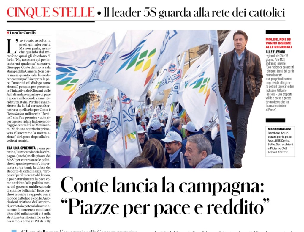 Immagina una rete, l’avvocato. E al fattoquotidiano.it, che gli chiede della raccolta firme immaginata dal giurista Ugo Mattei per un referendum sul divieto di esportazione di armamenti in territori bellici, garantisce: “Noi del M5S siamo conseguenti verso ogni iniziativa che possa aiutare”. Abbraccia l’esponente di Demos, Paolo Ciani, l’unico deputato dem a votare contro l’invio di armi all’Ucraina, lo scorso gennaio. Poi appare alla buvette assieme a un gruppo di cronisti. “Vi vedo preoccupati, avete paura che qualche politico vi rubi il mestiere?” sorride, e il riferimento ovviamente è a Matteo Renzi, neo-direttore del Riformista. Però non scherza quando con i suoi osserva: “Alla manifestazione per la pace di novembre c’erano 100 mila persone, ma non sono state ascoltate”. Le vuole rappresentare innanzitutto lui, sfruttando le timidezze della “rossa” Schlein che però vola nei sondaggi. Così per recuperare è tornato a guardare anche al centro.
