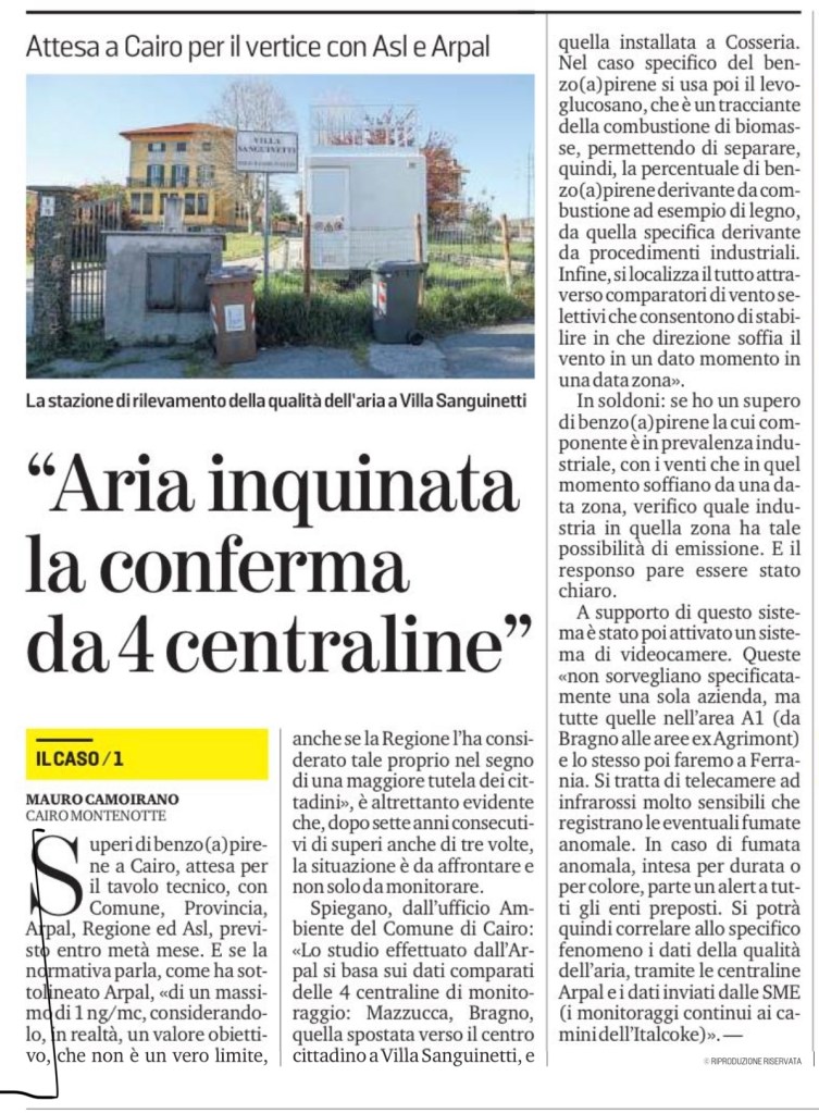 Spiegano, dall’ufficio Ambiente del Comune di Cairo: «Lo studio effettuato dall’Arpal si basa sui dati comparati delle 4 centraline di monitoraggio: Mazzucca, Bragno, quella spostata verso il centro cittadino a Villa Sanguinetti, e quella installata a Cosseria. Nel caso specifico del benzo(a)pirene si usa poi il levoglucosano, che è un tracciante della combustione di biomasse, permettendo di separare, quindi, la percentuale di benzo(a)pirene derivante da combustione ad esempio di legno, da quella specifica derivante da procedimenti industriali. Infine, si localizza il tutto attraverso comparatori di vento selettivi che consentono di stabilire in che direzione soffia il vento in un dato momento in una data zona».