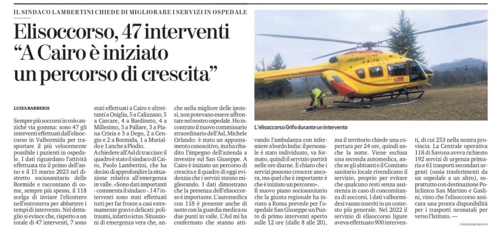 Sempre più soccorsi in volo anziché via gomma: sono 47 gli interventi effettuati dall’elisoccorso in Valbormida per trasportare il più velocemente possibile i pazienti in ospedale. I dati riguardano l’attività effettuata tra il primo dell’anno e il 15 marzo 2023 nel distretto sociosanitario delle Bormide e raccontano di come, sempre più spesso, il 118 scelga di inviare l’elicottero nell’entroterra per abbattere i tempi di intervento. Nel dettaglio si evince che, rispetto a un totale di 47 interventi, 7 sono stati effettuati a Cairo e altrettanti a Osiglia, 5 a Calizzano, 5 a Carcare, 4 a Bardineto, 4 a Millesimo, 3 a Pallare, 3 a Piana Crixia e 3 a Dego, 2 a Cengio e 2 a Bormida, 1 a Murialdo e 1 anche a Plodio.