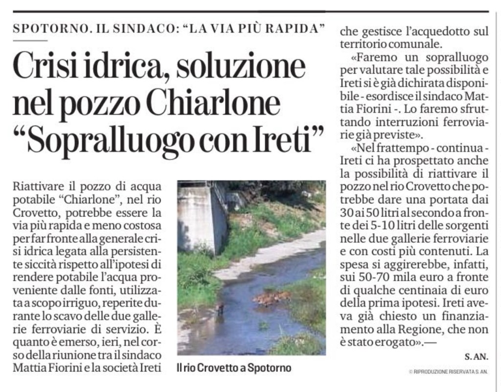 Riattivare il pozzo di acqua potabile “Chiarlone”, nel rio Crovetto, potrebbe essere la via più rapida e meno costosa per far fronte alla generale crisi idrica legata alla persistente siccità rispetto all’ipotesi di rendere potabile l’acqua proveniente dalle fonti, utilizzata a scopo irriguo, reperite durante lo scavo delle due gallerie ferroviarie di servizio. È quanto è emerso, ieri, nel corso della riunione tra il sindaco Mattia Fiorini e la società Ireti che gestisce l’acquedotto sul territorio comunale.