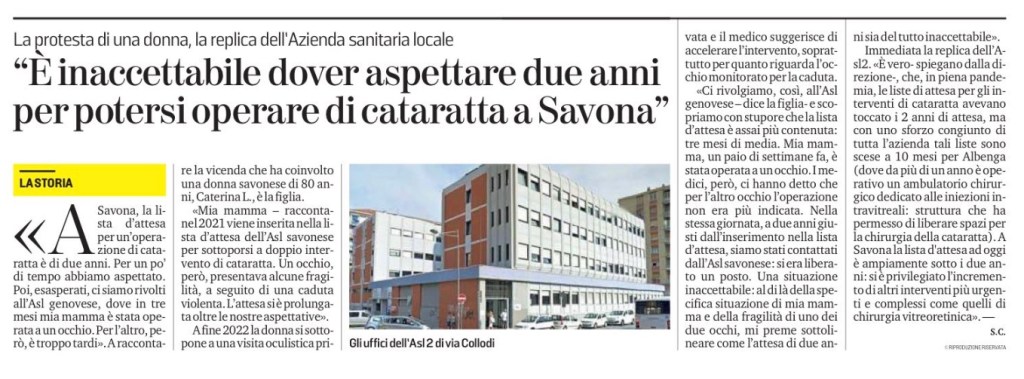 «Ci rivolgiamo, così, all’Asl genovese – dice la figlia- e scopriamo con stupore che la lista d’attesa è assai più contenuta: tre mesi di media. Mia mamma, un paio di settimane fa, è stata operata a un occhio. I medici, però, ci hanno detto che per l’altro occhio l’operazione non era più indicata. Nella stessa giornata, a due anni giusti dall’inserimento nella lista d’attesa, siamo stati contattati dall’Asl savonese: si era liberato un posto. Una situazione inaccettabile: al di là della specifica situazione di mia mamma e della fragilità di uno dei due occhi, mi preme sottolineare come l’attesa di due anni sia del tutto inaccettabile».