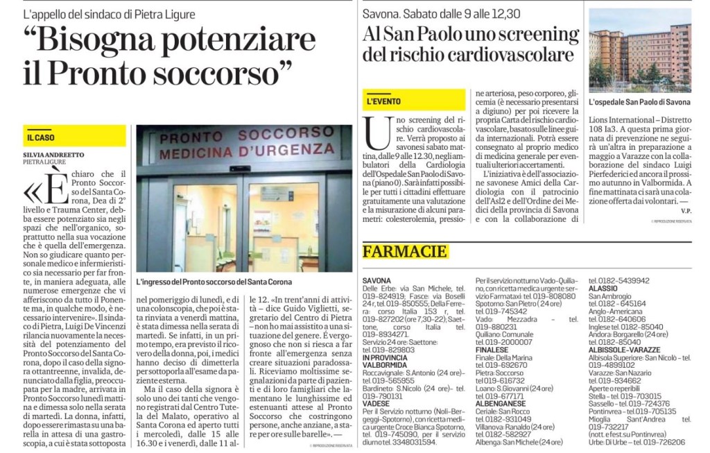 L’iniziativa è dell’associazione savonese Amici della Cardiologia con il patrocinio dell’Asl2 e dell’Ordine dei Medici della provincia di Savona e con la collaborazione di Lions International – Distretto 108 Ia3. A questa prima giornata di prevenzione ne seguirà un’altra in preparazione a maggio a Varazze con la collaborazione del sindaco Luigi Pierfederici ed ancora il prossimo autunno in Valbormida. A fine mattinata ci sarà una colazione offerta dai volontari. —