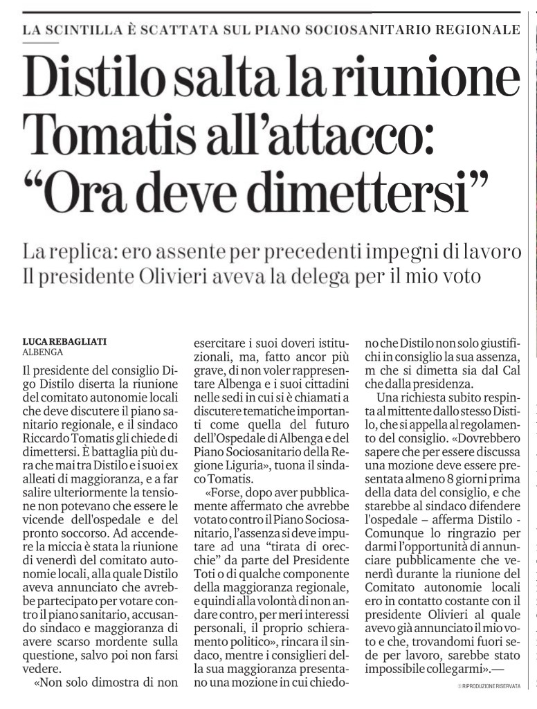 «Forse, dopo aver pubblicamente affermato che avrebbe votato contro il Piano Sociosanitario, l’assenza si deve imputare ad una “tirata di orecchie” da parte del Presidente Toti o di qualche componente della maggioranza regionale, e quindi alla volontà di non andare contro, per meri interessi personali, il proprio schieramento politico», rincara il sindaco, mentre i consiglieri della sua maggioranza presentano una mozione in cui chiedono che Distilo non solo giustifichi in consiglio la sua assenza, m che si dimetta sia dal Cal che dalla presidenza.